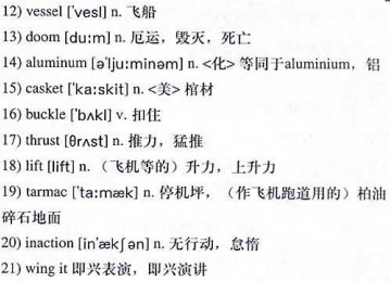 There were moans, as if we had all boarded a 12)vessel of 13)doom. It seemed that, we were all seated in an 14)aluminum 15)casket, 16)buckled next to strangers. After all, the pilot said he was frustrated. He told us our one engine was working double time, and his elaborate plan was to get up in the air, and see what happens! Then we did. We got up in the air, and what happened? Nothing—other than 17)thrust and 18)lift. We arrived in Norfolk, and no sooner had the wheels touched the 19)tarmac than a round of applause burst out, as everyone throughout the airplane simultaneously breathed a sigh of relief.