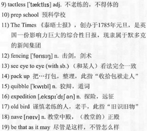 Clive: It’s not quibble. Look, education—being educated—you just can’t talk about it in that way. It’s something quite different—like setting off on an 16)expedition into the jungle. Gradually all the things you know disappear. The 17)old birds fly out of the sky, new ones fly in you’ve never seen before, and everything surprises you. Trees you expected to be a few feet high grow right up overhead, like the 18)nave of Wells Cathedral. Anyway, if you had seen all this before, you would not have to go looking. I think education is simply the process of being taken by surprise, do you see?